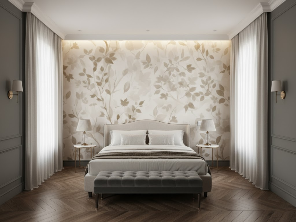 Ova nježna tapeta unosi u prostor osjećaj spokojne elegancije, s nježno oslikanim motivima lišća koji plešu u nijansama sive i bež boje. Idealna je za dnevni boravak ili spavaću sobu gdje će stvoriti umirujuću, prirodnu atmosferu, pozivajući Vas da se opustite uz šalicu čaja ili knjigu. Tapeta obavija prostor toplinom i suptilnom kreativnošću, savršeno se uklapajući u moderno opremljene interijere gdje naglašava sofisticirani stil.