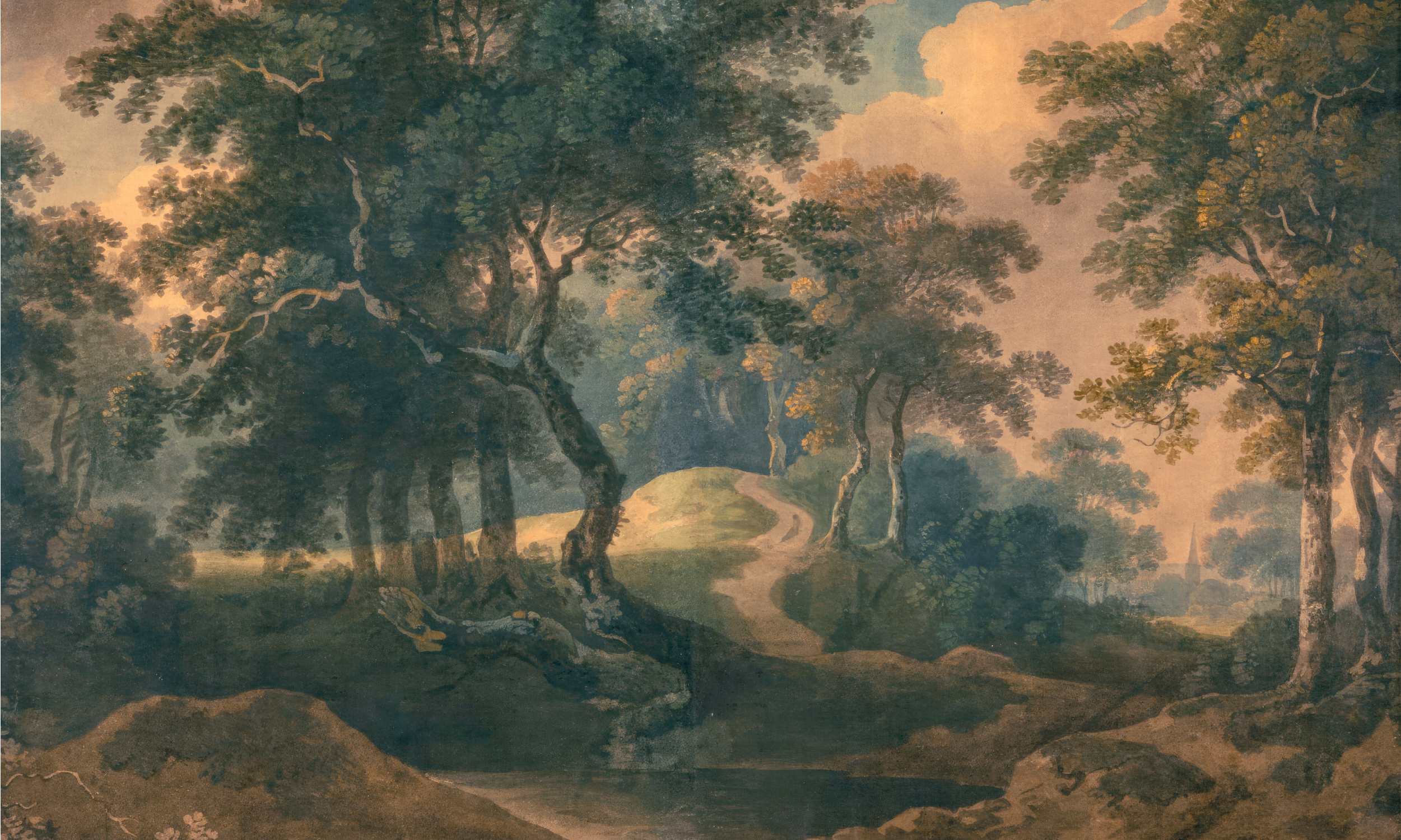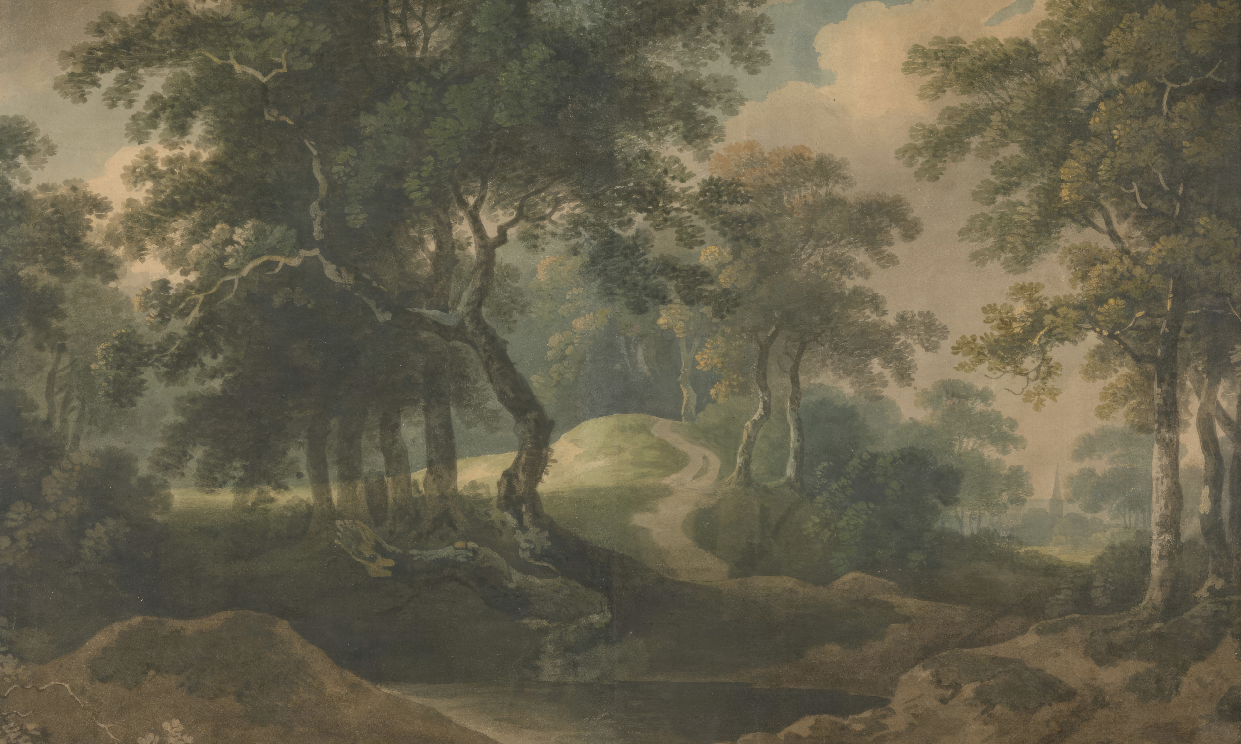 Slika prikazuje mističnu šumu s gustom krošnjom drveća. Put se proteže kroz krajolik, vodeći do obzora. Svjetlost prolazi kroz lišće stvarajući igru sjena. Cijeli prizor odiše spokojem i harmonijom s prirodom. Ova umjetnost poziva promatrača da istraži zagonetnosti skrivene unutar šume.