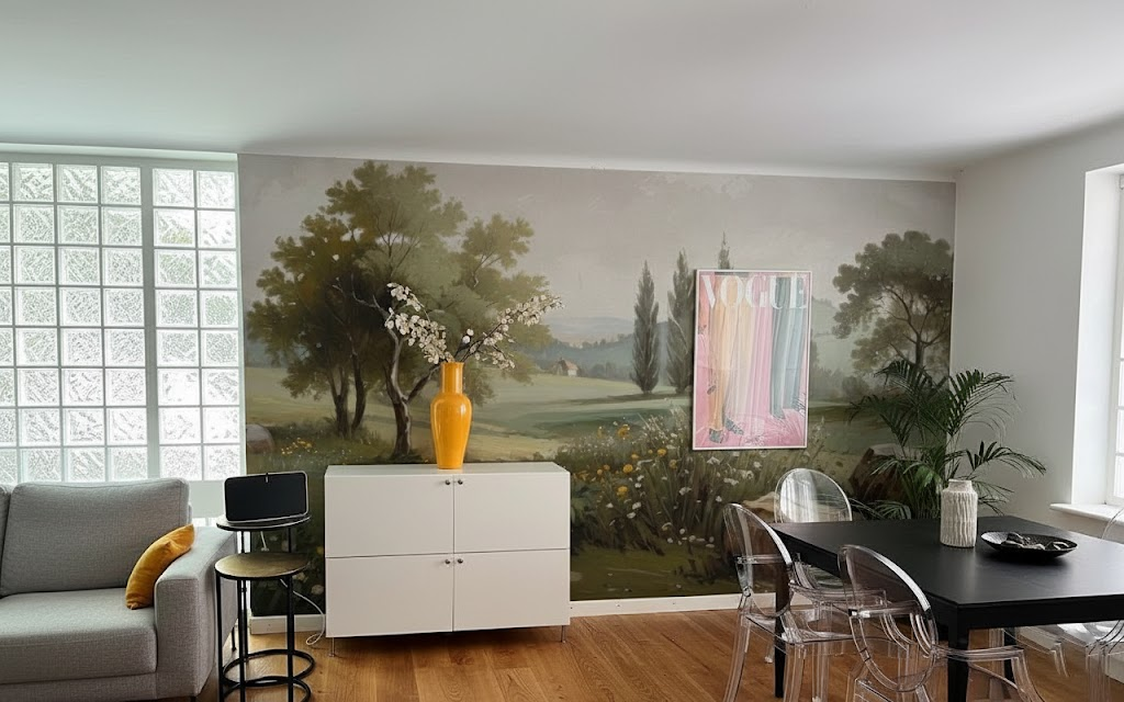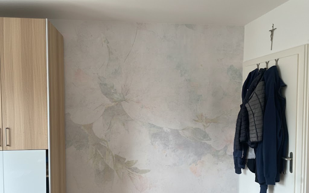 • Pri postavljanju trake tapete, postupak započnite slijeva na desno dok ste okrenuti prema zidu. Koristite vaservagu za označavanje okomito ravne crte širine ploče na zidu kako biste osigurali da prva traka tapete bude ravno obješena, koja je isto tako ključna za uspješno postavljanje cijelog murala.