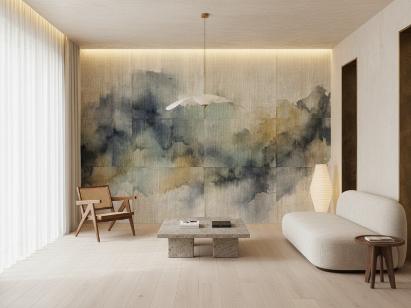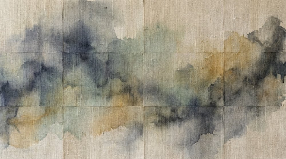 Otkrijte ljepotu nesavršenosti s ovom jedinstvenom zidnom tapetom koja imitira teksturu grubog lana oslikanog akvarelom. Meki prijelazi indigo plave, zemljane oker žute i maglovite zelene boje stvaraju dojam apstraktnog horizonta, unoseći mir i umjetničku dubinu u prostor. Savršen odabir za interijere koji njeguju 'Wabi-Sabi' estetiku i tihi luksuz.