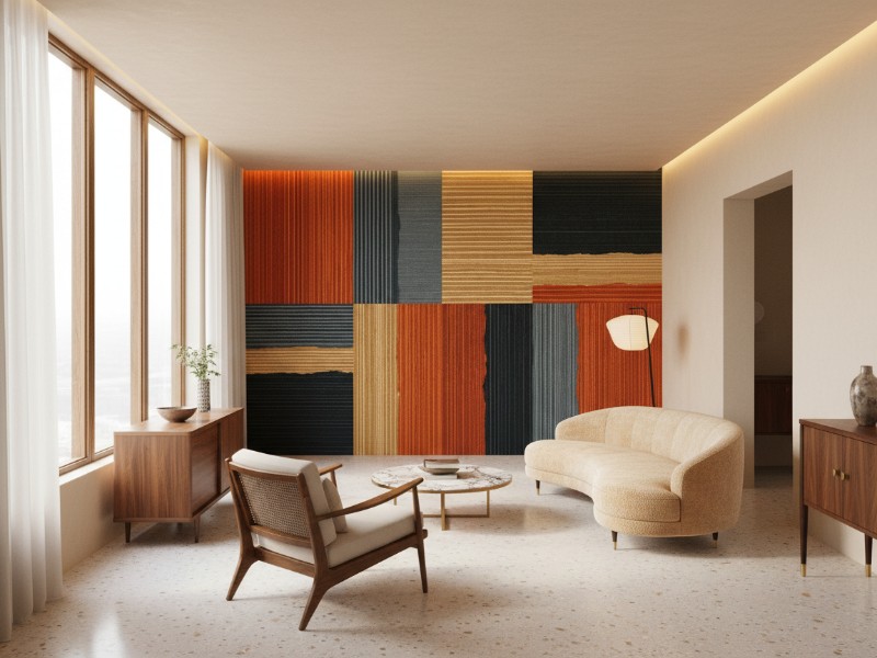 Ova sofisticirana tapeta donosi toplinu i strukturu u prostor kroz kolaž geometrijskih oblika inspiriranih tkanim teksturama. Bogata paleta terakote, škriljevac sive i zlatne bež boje stvara upečatljiv vizualni ritam koji podsjeća na estetiku Bauhausa i dizajn sredine prošlog stoljeća. Idealna je za stvaranje fokusne točke u modernim dnevnim boravcima ili kreativnim uredima, unoseći osjećaj taktilnosti i umjetničkog izražaja na ravnu površinu zida.