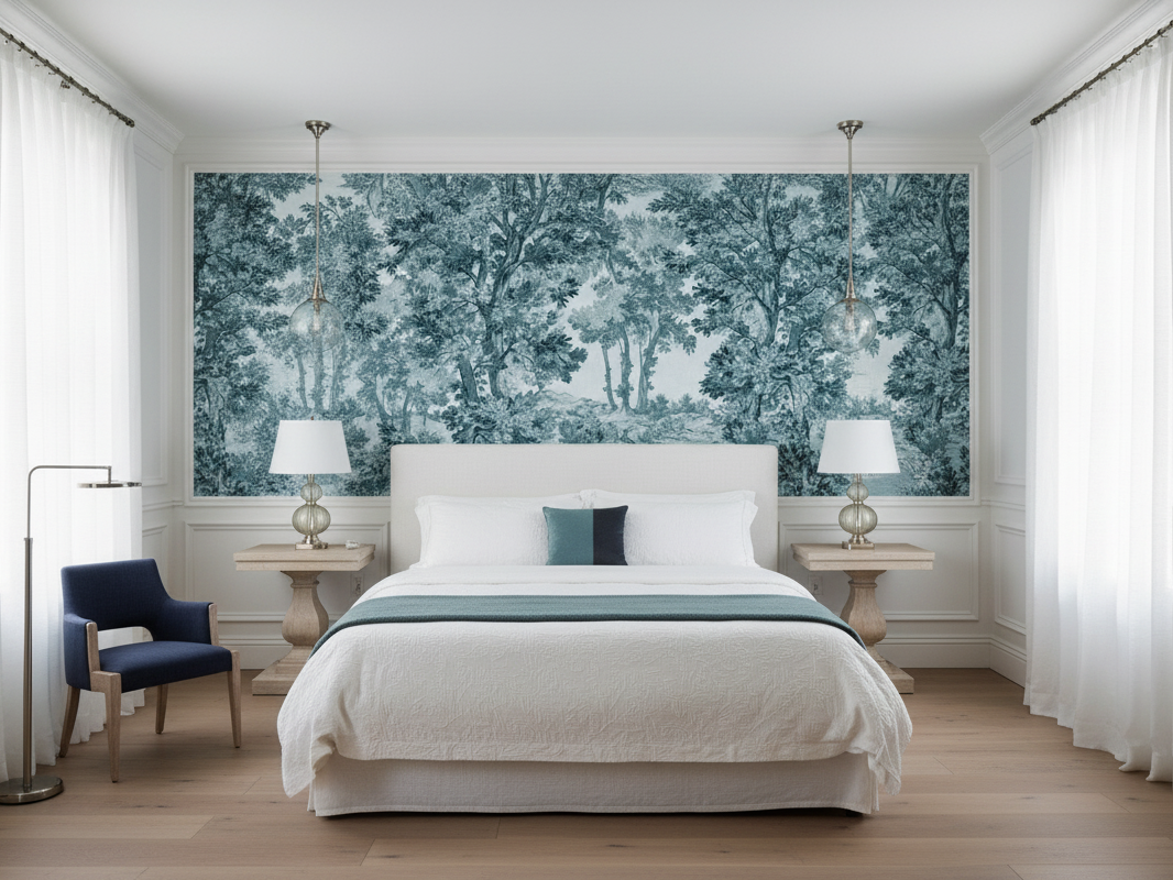 Ova tapeta prikazuje mirnu prirodnu scenu u kojoj se ističe bogatstvo zelenih nijansi. Detalji drveća i lišća stvaraju osjećaj dubine i smirenosti. Idealna je za stvaranje opuštajuće atmosfere u domu ili uredu. Uz to, dizajn poziva na razmišljanje o prirodi i njezinoj ljepoti. Savršeno se uklapa u prostore koji zahtijevaju dodir prirodne elegancije.