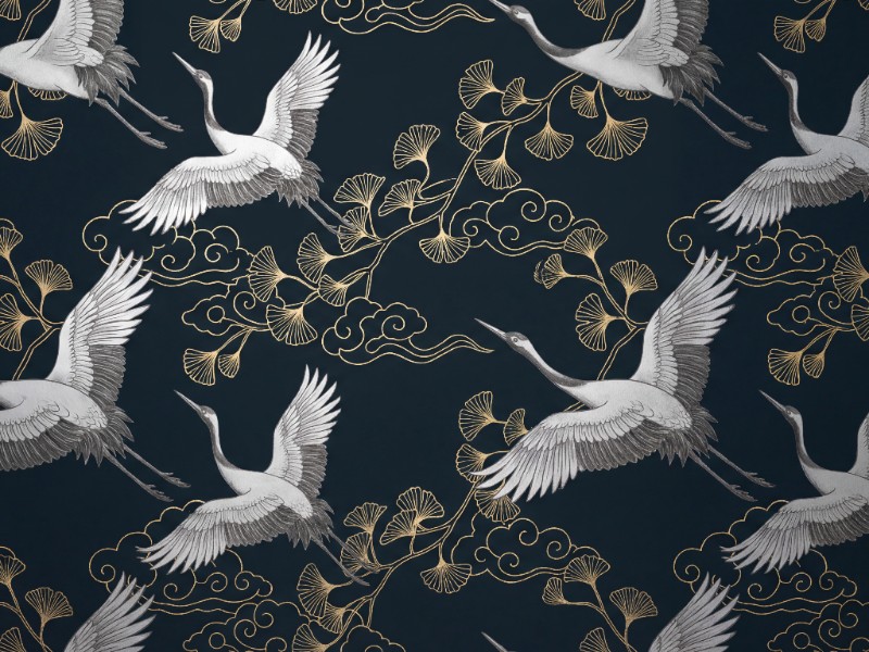 Ovaj zidni uzorak odiše mirnom elegancijom, prikazujući graciozne ždralove u letu među stiliziranim granama ginka. Suptilna tekstura tapete doprinosi dubini, stvarajući osjećaj mira i sofisticiranosti u prostoru. Zlatni detalji dodaju notu luksuza, dok tamna pozadina naglašava umjetničku izvedbu i pruža umirujući ambijent.