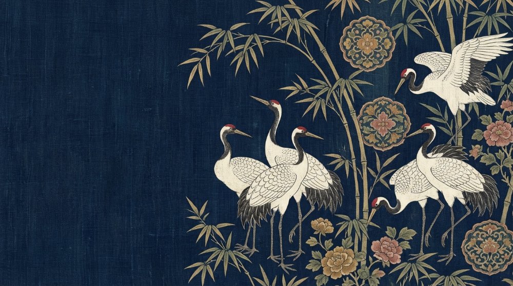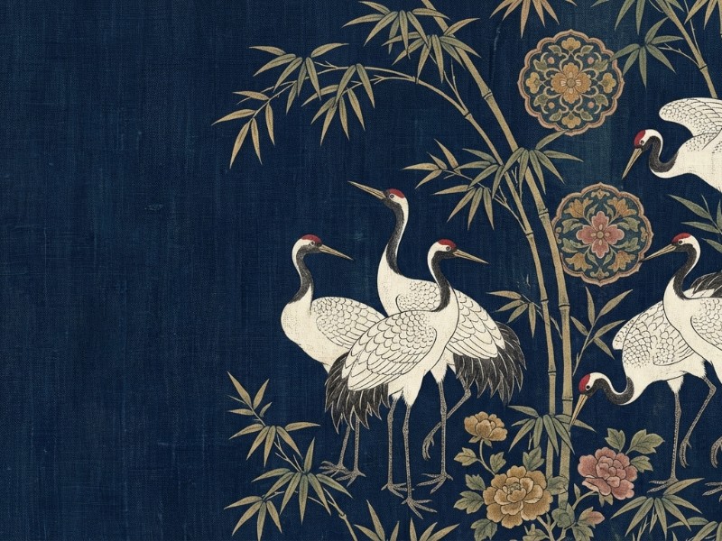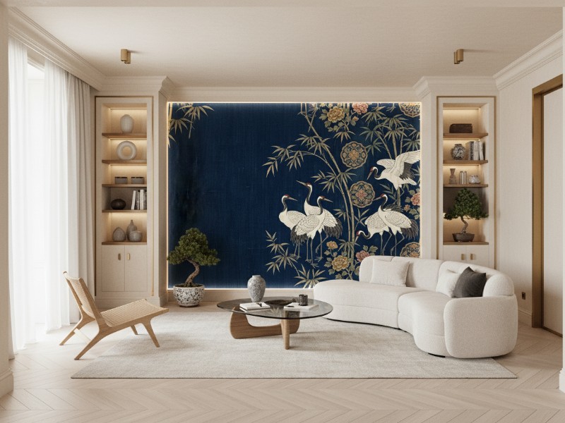 Unesite duh dalekog istoka i bezvremensku eleganciju u svoj interijer s ovom raskošnom tapetom. Dizajn prikazuje graciozne ždralove u letu i stajanju, okružene stiliziranim bambusom i cvjetnim medaljonima, sve postavljeno na duboku, teksturiranu indigo plavu pozadinu koja imitira izgled luksuznog tkanog platna. Ova tapeta savršeno utjelovljuje 'Quiet Luxury' estetiku, spajajući bogatu povijesnu Chinoiserie umjetnost s modernom sofisticiranošću. Idealna je za stvaranje dramatičnog, ali smirujućeg zida u dnevnim boravcima ili kao profinjena pozadina u glavnoj spavaćoj sobi.