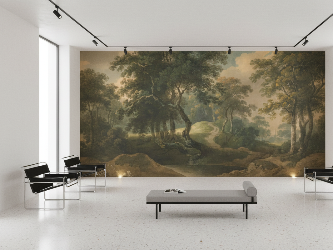 Slika prikazuje mističnu šumu s gustom krošnjom drveća. Put se proteže kroz krajolik, vodeći do obzora. Svjetlost prolazi kroz lišće stvarajući igru sjena. Cijeli prizor odiše spokojem i harmonijom s prirodom. Ova umjetnost poziva promatrača da istraži zagonetnosti skrivene unutar šume.