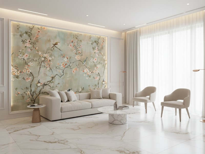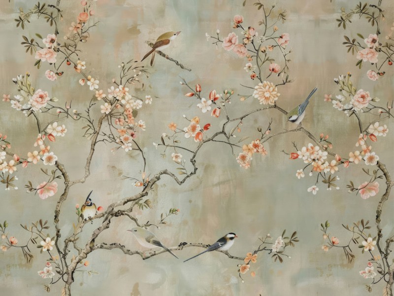 Ova tapeta prikazuje delikatne grane trešnjinog cvijeta u punom cvatu, s nježno oslikanim pticama koje mirno sjede među laticama. Akvarelna tehnika stvara prozračnu i sanjivu pozadinu koja odiše bezvremenskom elegancijom. Svaki detalj odražava preciznu umjetničku izvedbu, donoseći osjećaj spokoja i prirodne ljepote u prostor.