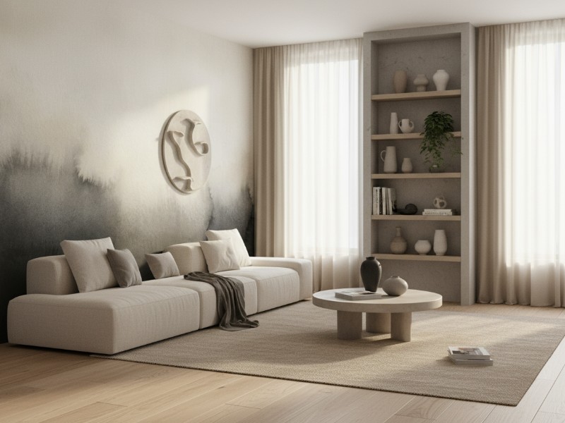 Ovaj dizajn tapete nježno oslikava prijelaz od eterične svjetlosti do duboke, mirne sjene. Akvarelna tehnika stvara fluidan gradijent, dodajući prostoru teksturu i dimenziju bez ometanja. Svaki pogled otkriva suptilne varijacije u tonovima, pozivajući na smirenost i promišljanje.