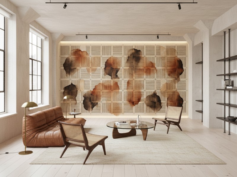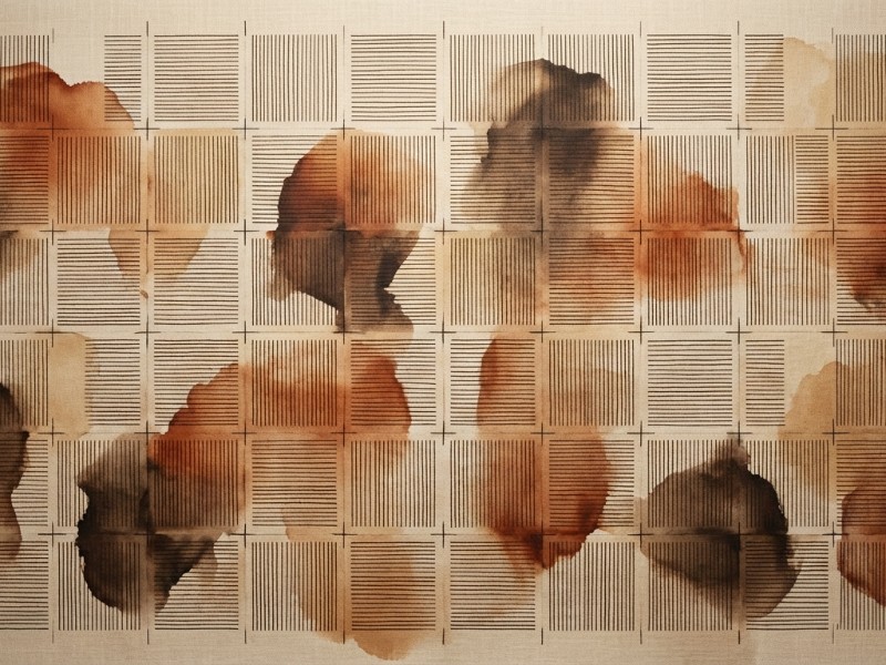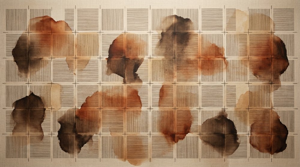 Spoj precizne arhitektonske geometrije i fluidnih organskih oblika definira ovu zidnu tapetu. Tanke, tehničke linije mreže u kontrastu su s toplim mrljama akvarela u tonovima terakote i hrđe, stvarajući vizualnu ravnotežu između strogosti i emocije. Idealan odabir za moderne prostore koji teže industrijskom šiku s notom umjetničke topline, savršeno se uklapajući u 'Quiet Luxury' estetiku.