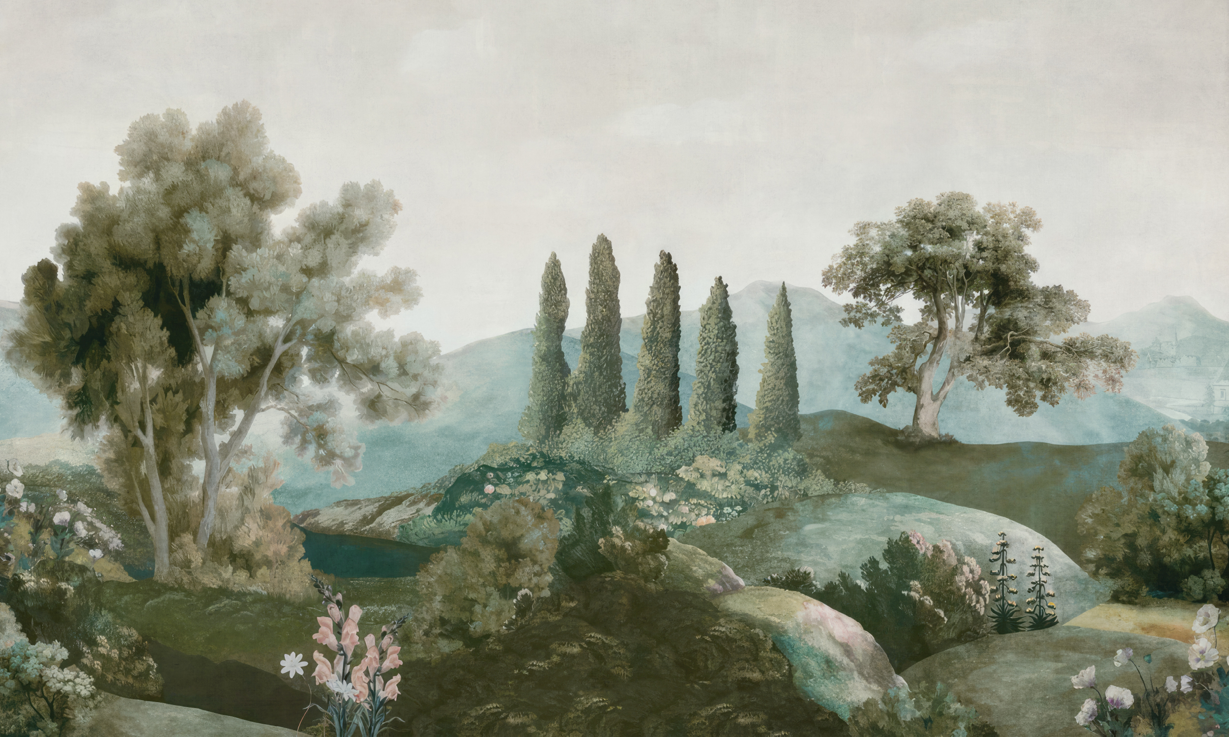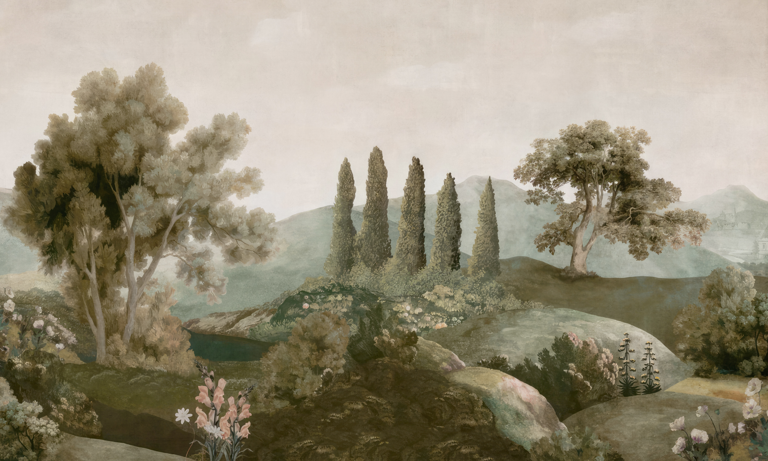 Ova slika prikazuje miran pejzaž s drvećem i nježnim obrisima planina u daljini. Dominiraju umirujuće nijanse sive koje stvaraju atmosferu smirenosti. Detalji kao što su cvijeće i zelenilo dodaju prirodne elemente slici. Cijela scena odiše elegancijom i bezvremenskom ljepotom. Ova umjetnička kompozicija idealna je za stvaranje opuštajuće atmosfere u svakom prostoru.